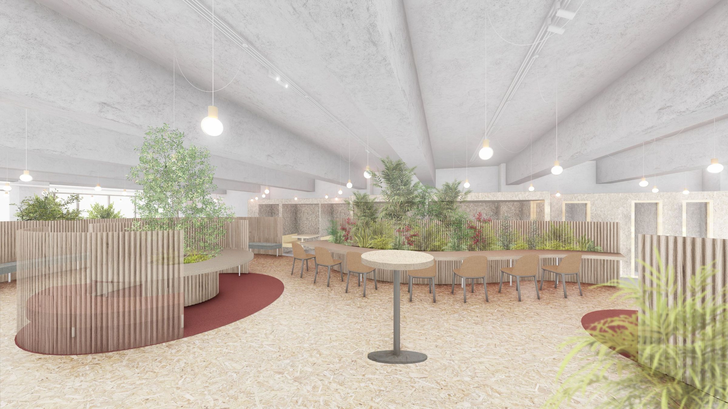 また、ワークラウンジにはグリーンをたっぷり配置します。パソコンから少し目を上げたときに元気な植物が見られると、心が和むのではと思います。